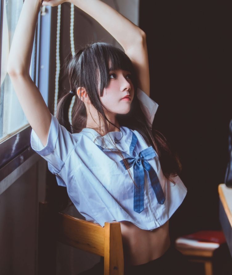 不仅如此,水手服的搭配十分巧妙,宽松的裙摆与她紧紧贴合的白色袜子相得益彰,完美的展现了校园少女的青春气息。每一个动作,每一个小小的转身,都透露出她对这一角色的深入理解和热爱。无论是轻轻托起书包的动作,还是在课桌旁的悠闲坐姿,都在诠释着她对于这一角色的细腻诠释。